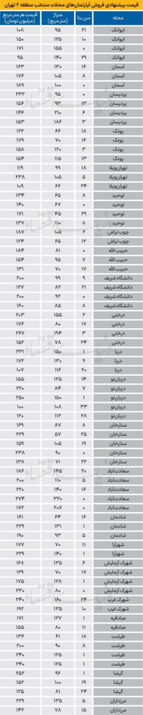 قیمت پیشنهادی آپارتمان‌های عرضه شده در منطقه ۲ تهران در فایل‌های مورد بررسی طی ۱۰ روز ابتدایی مهر از کف قیمت ۱۰۸ میلیون تومان تا ۳۰۰ میلیون تومان در نوسان است.