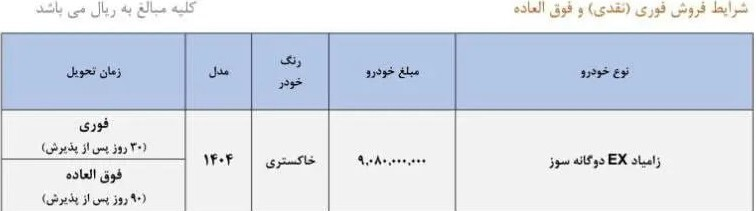 در این مرحله از فروش، خودرو زامیاد EX دوگانهسوز با قیمت قطعی ۹۰۸ میلیون تومان عرضه میشود. این طرح شامل دو نوع فروش فوری (تحویل ۳۰ روزه) و فروش فوقالعاده (تحویل ۹۰ روزه) خواهد بود.