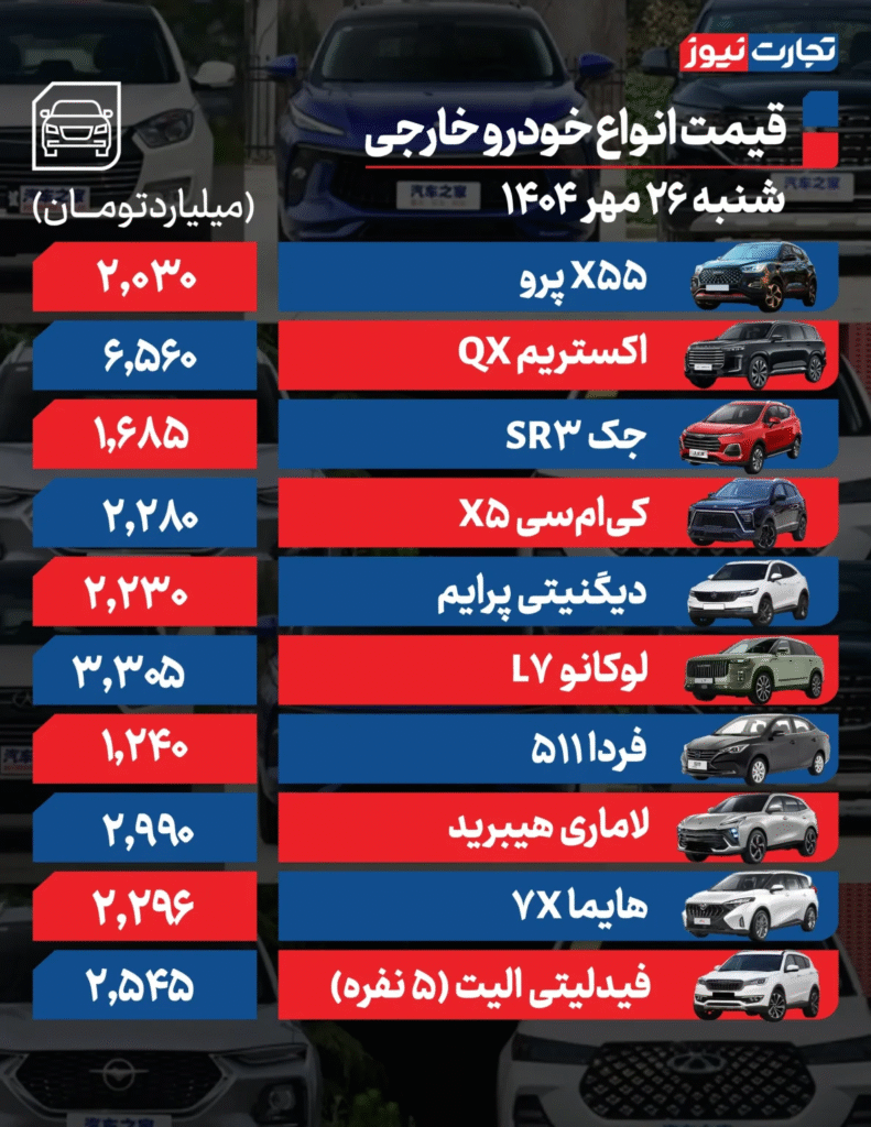 اعلام قیمت خودروهای خارجی و داخلی امروز شنبه ۲۶ مهر ۱۴۰۴/ برخی محصولات ایران خودرو در اوج