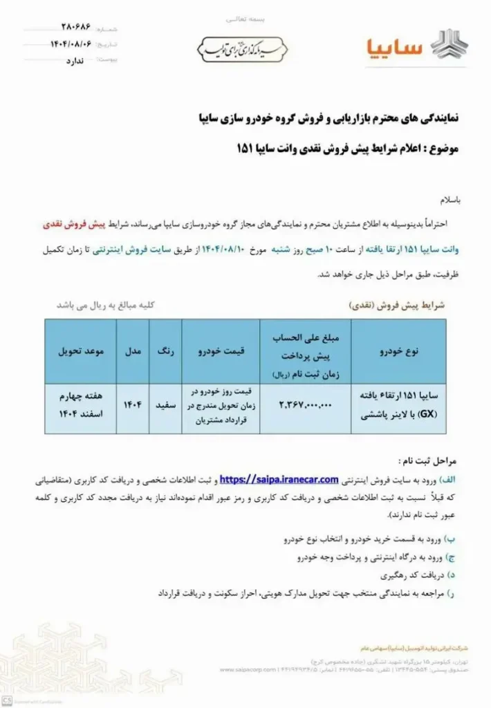 شرکت سایپا اعلام کرده است که از ساعت ۱۰ صبح روز شنبه، ۱۰ آبانماه، مرحله جدید پیشفروش وانت سایپا ۱۵۱ آغاز میشود. این طرح بهصورت نقدی اجرا خواهد شد و متقاضیان میتوانند برای خرید این خودروی سبک و کارآمد شهری ثبتنام کنند.