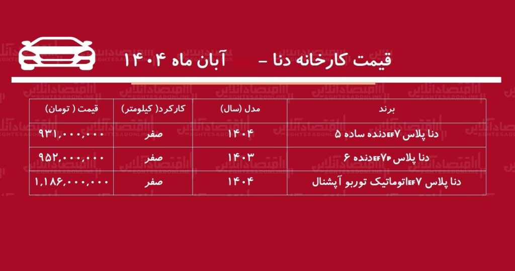 بر اساس اطلاعیه تازه ایرانخودرو، قیمت دنا پلاس EF7 اتوماتیک توربو آپشنال از ابتدای آبانماه با رشد ۳۳ میلیون تومانی روبهرو شده و اکنون به یک میلیارد و ۱۸۶ میلیون تومان رسیده است.