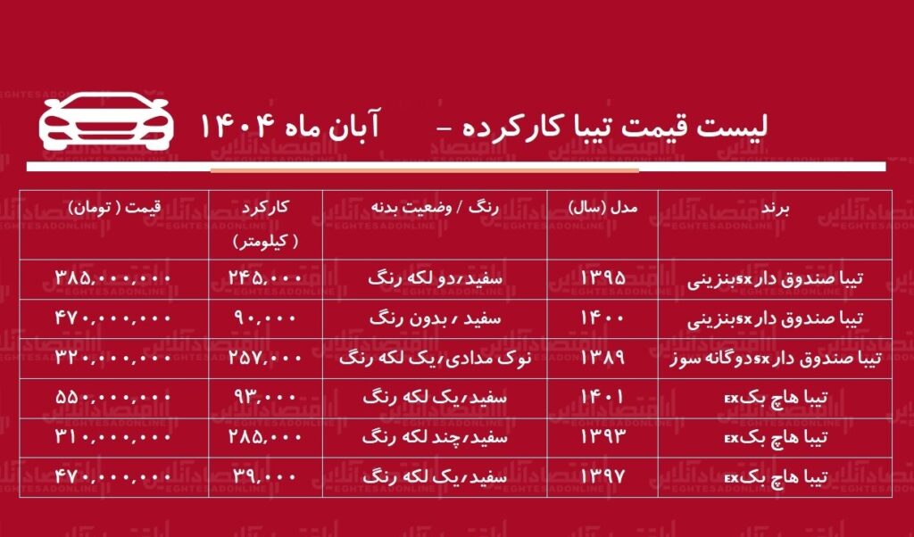 تیبا کارکرده امروز شنبه ۱۷ آبان ۱۴۰۴ چقدر است؟ / با کمتر از ۳۰۰ میلیون تیبا خریداری کنید!