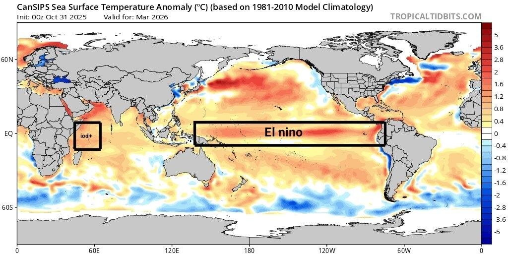 بر اساس جدیدترین دادههای مدل پیشبینی اقلیم کانادایی «Cansips»، احتمال وقوع همزمان دو پدیده مهم اقلیمی یعنی «النینو» و «دوقطبی مثبت اقیانوس هند (IOD)» در اواخر زمستان پیشرو افزایش یافته است. این ترکیب اقلیمی که در سالهای گذشته نیز سابقه داشته، معمولاً موجب افزایش بارشها در بخشهای مختلف ایران میشود و میتواند الگوهای دمایی و بارشی کشور را به شکل محسوسی تغییر دهد.