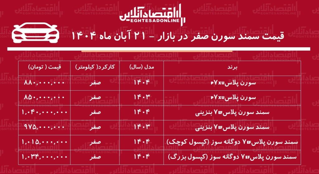 تازه‌ترین بررسی‌ها از بازار خودرو در روز چهارشنبه ۲۱ آبان‌ماه ۱۴۰۴ نشان می‌دهد که خانواده سمند سورن پلاس با افزایش چشمگیر قیمت روبه‌رو شده است.