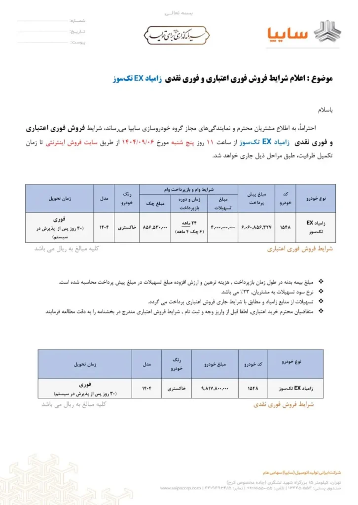 شرکت زامیاد فروش فوری خودروی زامیاد EX دوگانهسوز را در قالب شرایط نقدی و اعتباری اعلام کرده است. زمان تحویل این خودرو ۳۰ روز کاری در نظر گرفته شده و متقاضیان میتوانند از طریق سایت رسمی فروش سایپا نسبت به ثبت نام اقدام کنند.