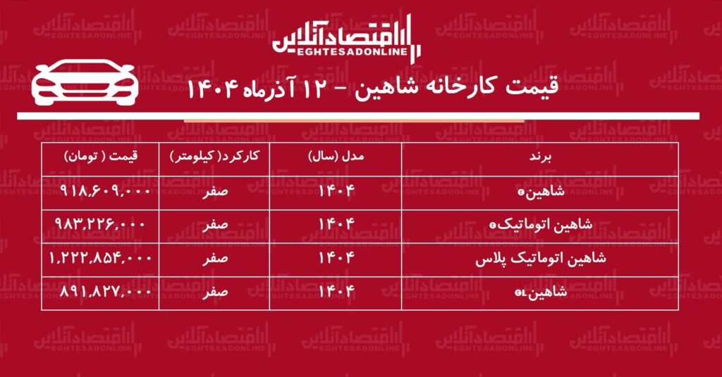 مدل شاهین اتوماتیک پلاس نیز از مرز ۹۷۵ میلیون تومان عبور کرده و در آبانماه با افزایش مشابهی، به رقم یک میلیارد و ۲۲۲ میلیون تومان دست یافته است.
